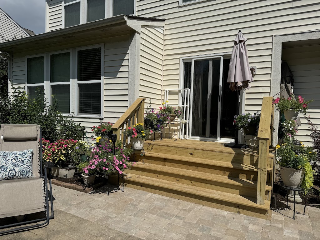 DeLong Landscaping did an outstanding job replacing our old back steps with a new “mini” deck with 9’ wide steps. They also extended our existing paver patio up to the new deck steps. Both the deck team and Brian(pavers) were professional and hard working. Our back area looks 100 times better than it did. I would not hesitate to use DeLong for future landscape projects. Thanks guys, it looks great !!!